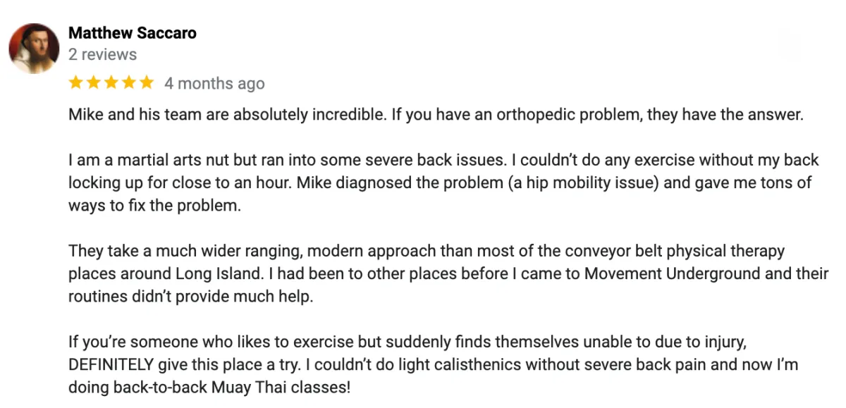 The Movement Underground looks and does things a little differently. Traditional physical therapy, has become watered down over the years due to heavy influence from large insurance carriers and Big Pharma. You see...it's more profitable to keep you hurting, not moving, and reliant on highly profitable interventions like drugs, injections, and surgery. The Movement Underground has unchained itself from conventional healthcare, and aims to identify the OBJECTIVE, ACTIONABLE, lifestyle, mobility, and functional fitness measures that make you a more robust and resilient human being.