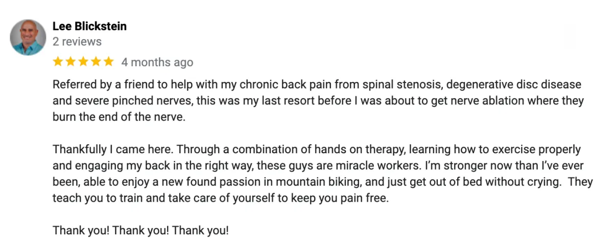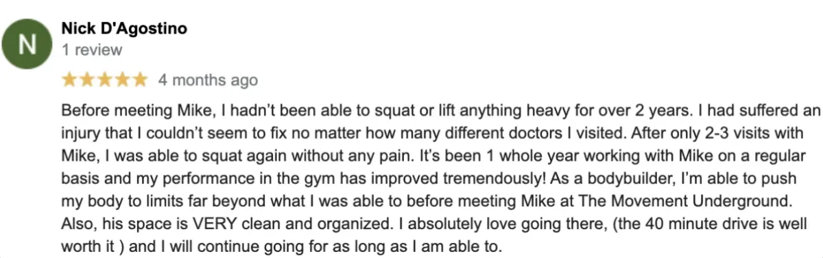 If you've read this far, you can probably tell we do things a little differently. The major difference is our comprehensive assessment on Day 1. We will spend about an hour together, 1:1, looking at you MOVE!