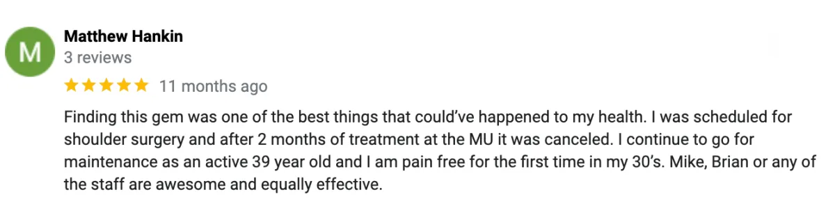 The remaining time is spent getting some quality, hands-on, manual therapy, aimed at addressing the root cause of your complaint, while also educating you on what you can begin to do on your own to make progress, whether you decide to sign up with or not.